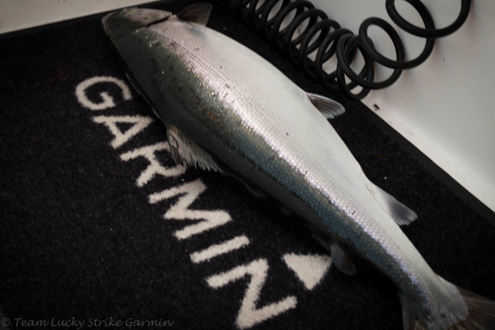 Stekhett sommarväder, runt 19 grader i ytvattnet i havet, vi hade tänkt testa köra tidig morgon och soluppgång, vi plockade i lite spön i båten igen och hakade på djupriggarna. Vi åkte ut igår kväll och inväntade natten, under kvällstimmarna tittar vi på mycket laxekon på panoptixen, men ingen vill hugga. Vi kör nattimmarna och inväntar gryningen och soluppgången. Vi får en fin soluppgång på havet och när ljuset börjar återvända och lite dimmbankar rullar in hugger första laxen, på en ismo magnum , vit och rosa, viktad med 280 gram, bakom en ghostparavan, den drillas in i håven, 6,5 kg. Vi vänder tillbaka i området och hakar på en lax igen på en ismo magnum, viktad med 60 gram. Nu är det en lite bättre lax på kroken, den drillas in och landar i håven, vikt 15 kg.